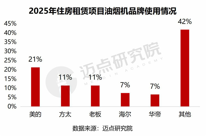 方太、老板作为高端专业品牌,在租赁市场保持了稳定且可观的份额。“双轨制”特征表现为:性价比与标准化轨道方面,以美的为代表,满足大部分房源对成本和统一管理的需求。品质与效果轨道方面,以方太、老板为代表,用于提升特定房源的配置和体验。