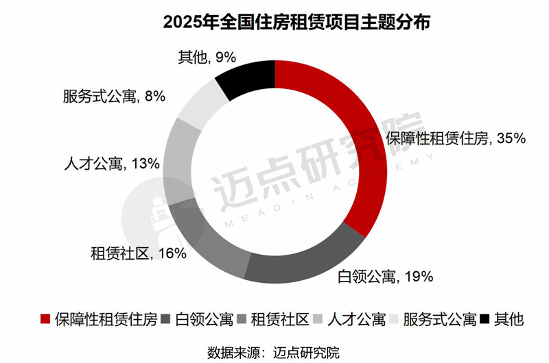 保障性租赁住房占比最高(35%),白领公寓、租赁社区、人才公寓占比处于10%-20%,服务式公寓也占领了一小部分市场份额(8%)。