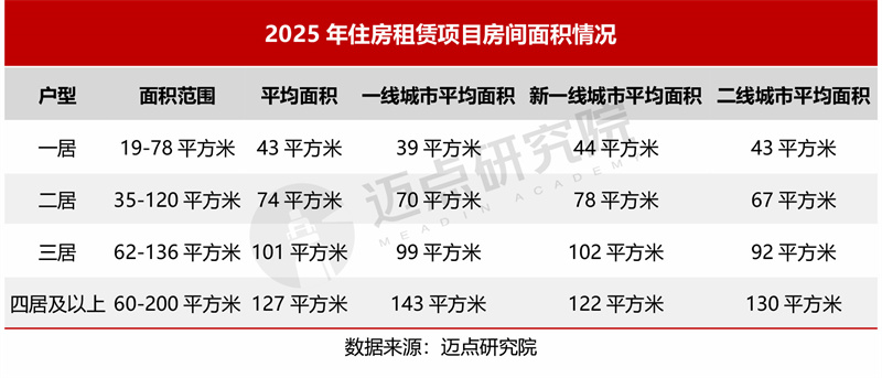 房间面积的设置为不同支付能力和生活阶段的租户提供了对应产品。比如一居室多为高性价比与灵活性的入门级产品,二居室满足合租与小家庭需求,三居室面向家庭型改善户型,四居及以上为高端产品。