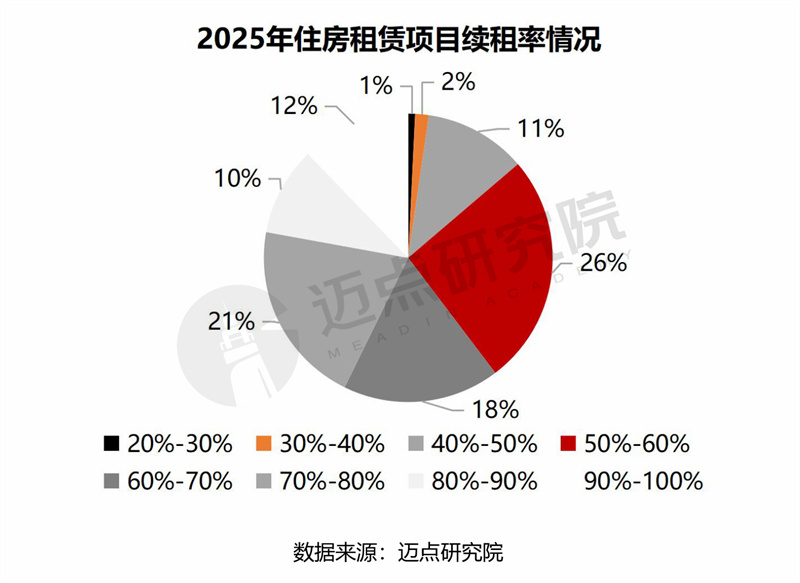 86%的项目续租率超过50%,其中续租率50%-60%的占比最高(26%);其次为70%-80%,占比21%;60%-70%、80%-90%、90%-100%的占比分别为18%、10%、12%。