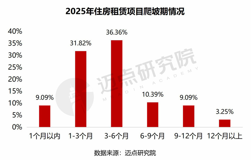 与去年相比,住房租赁项目的爬坡期相对稳定,爬坡期1-3个月的项目占比稍有下降,由39.31%降至31.82%;爬坡期3-6个月的项目占比有所上升,由28.97%上升至36.36%。整体而言,住房租赁项目爬坡期在半年以内可备认为是良好状态,总体上展现出较好的运营能力。